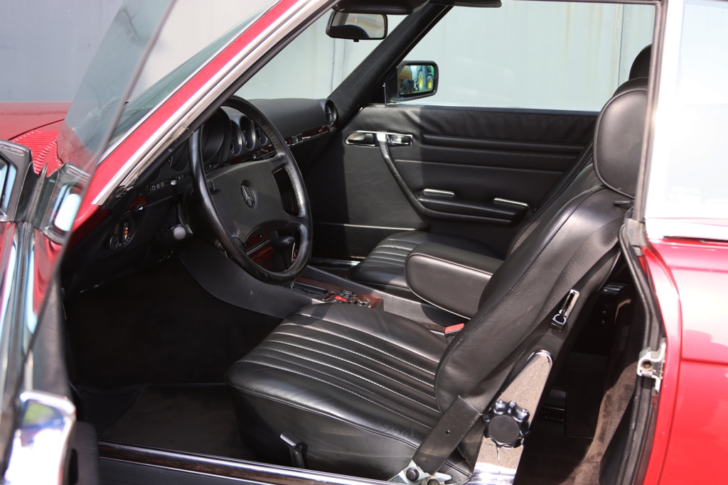 Een Mercedes 300SL Roadster in de voor dit model unieke, en slechts een jaar geproduceerde exterieurkleur Almadinrot metallic gecombineerd met zwart leder interieur. In Sindelfingen, Duitsland op 12 april 1989 nieuw geleverd aan Herr Kattner uit Stuttgart. Sinds mei 11991 in het bezit van de 2e. eigenaar een juwelier uit Düsseldorf. Smetteloze algemene conditie, zichtbaar vanaf nieuw tegen roest beschermd en aan alles te zien ’s winters nooit gebruikt. Gaaf interieur nagenoeg zonder gebruissporen, op het middengedeelte van de linker zijkant na in de fabriekslak.